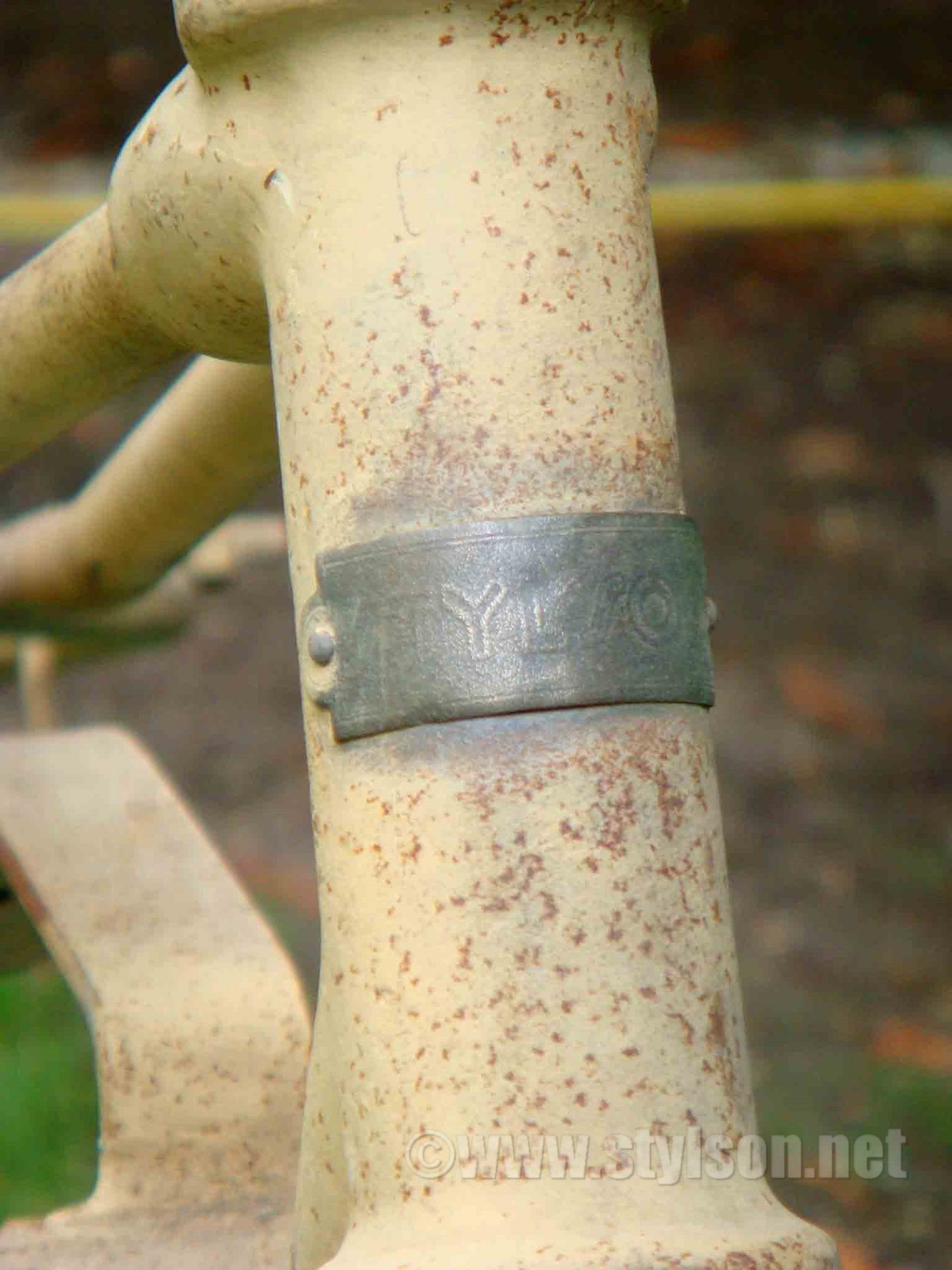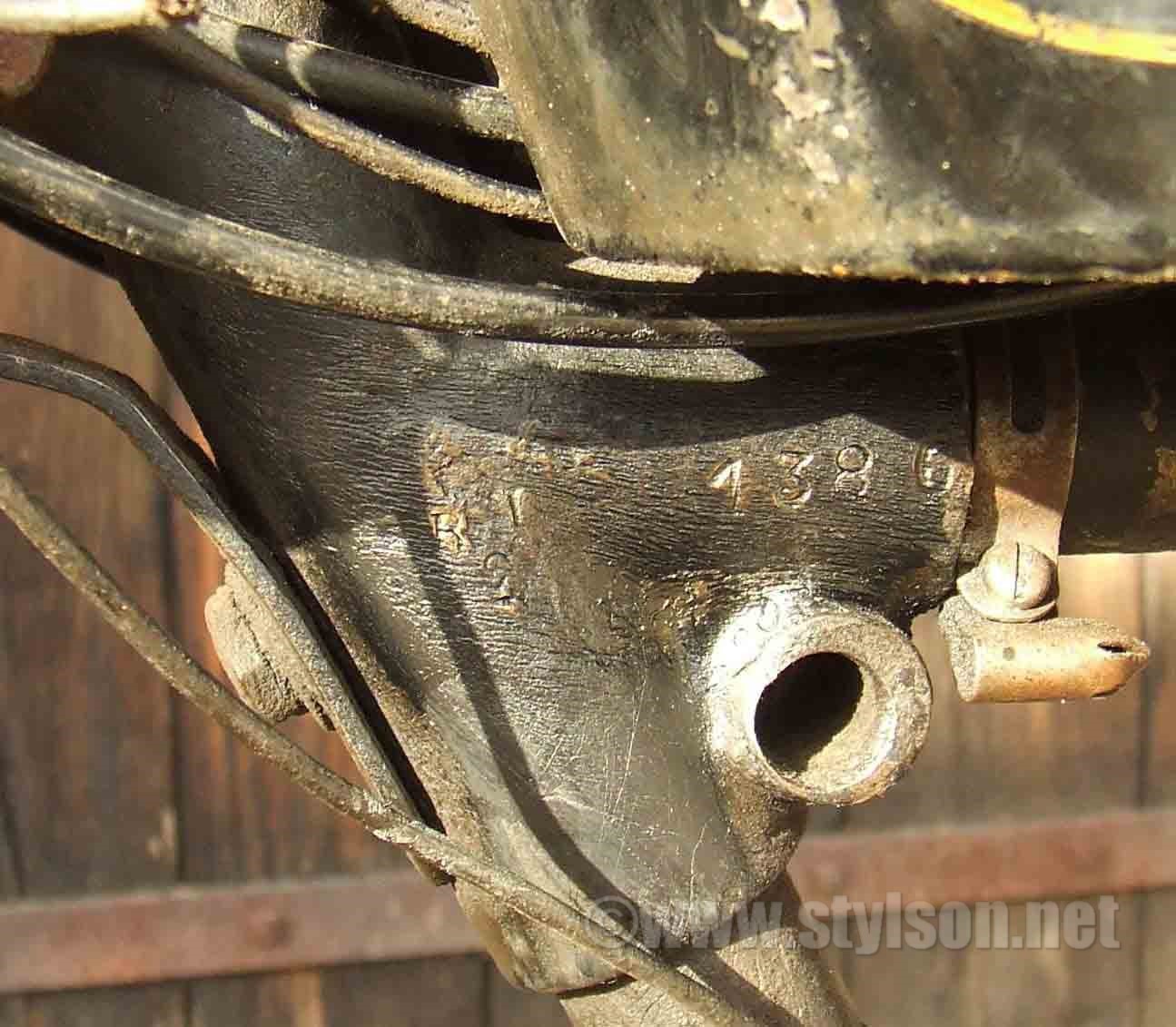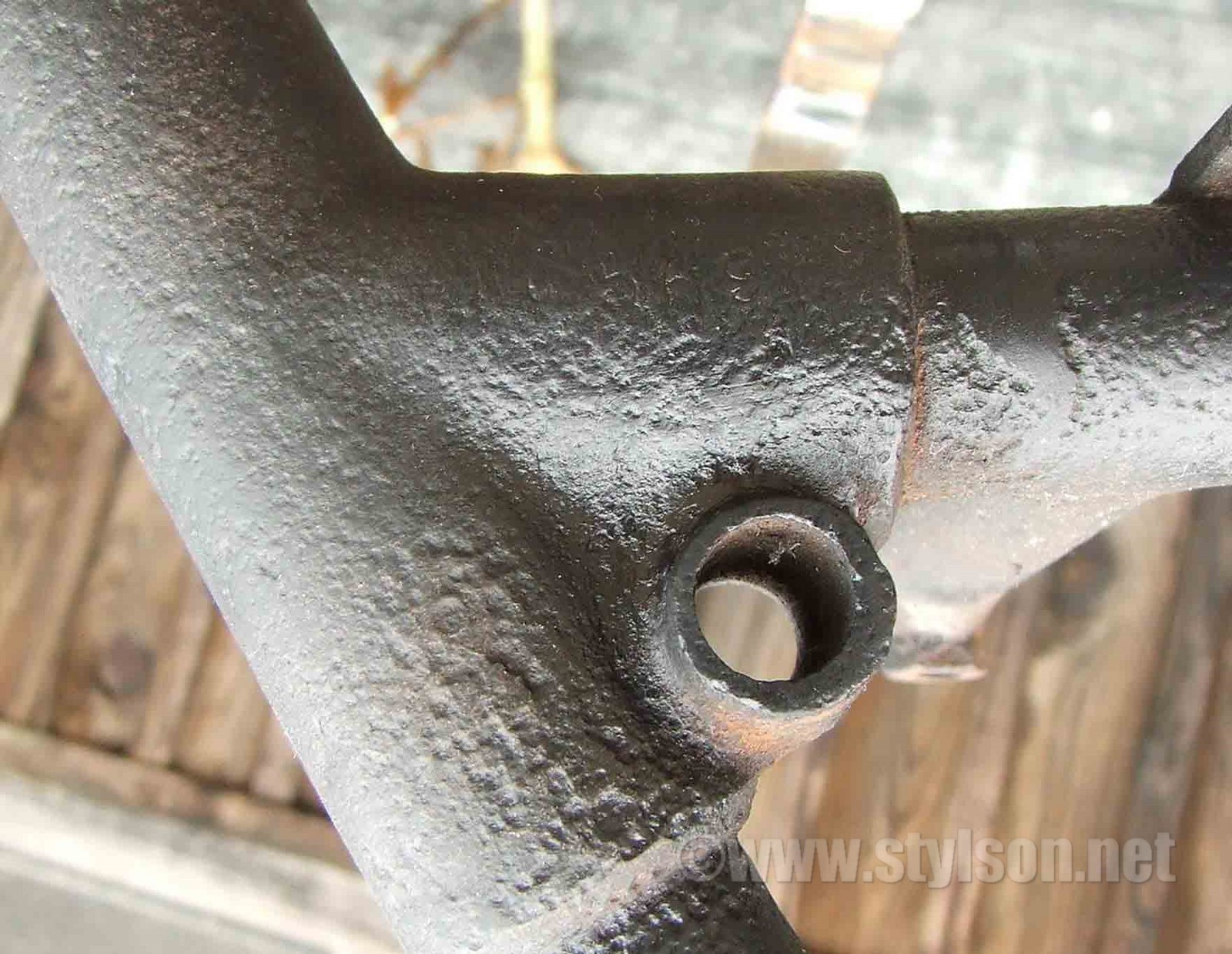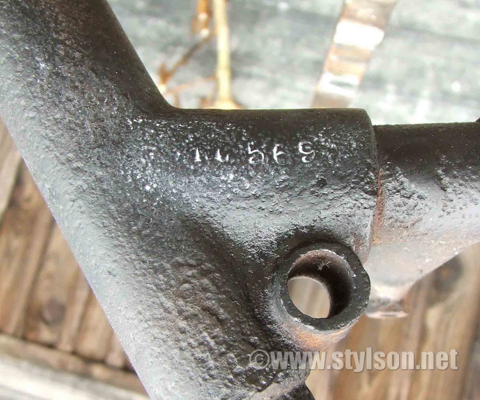 Voici un cas représentatif (voire extrême), à première vue aucun marquage sur la première photo. L'application d'une pâte blanche (polish...), suivi d'un essuyage fait apparaître les références de la machine sur ce cadre fortement piqué par la rouille : RC 569.