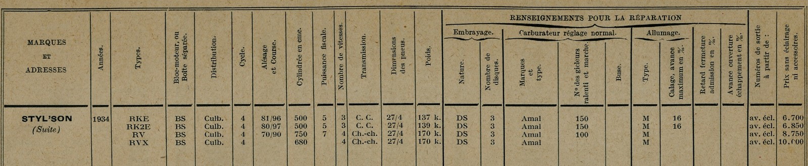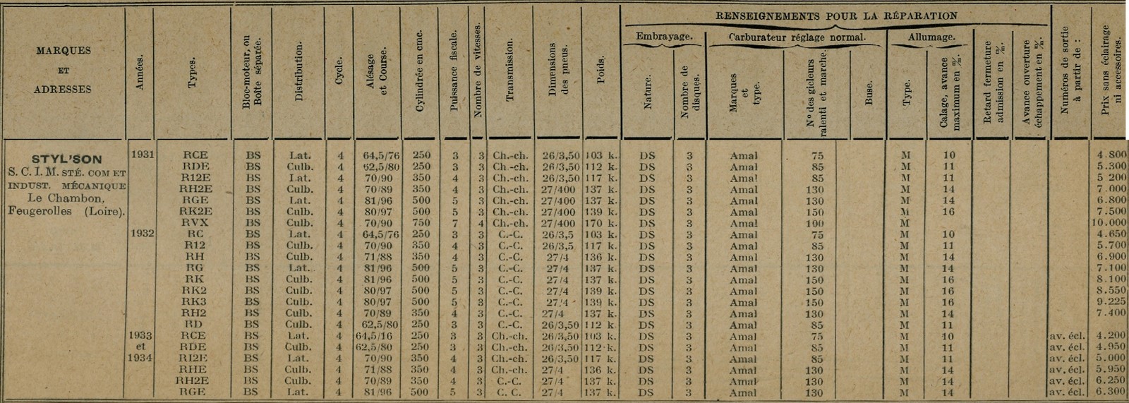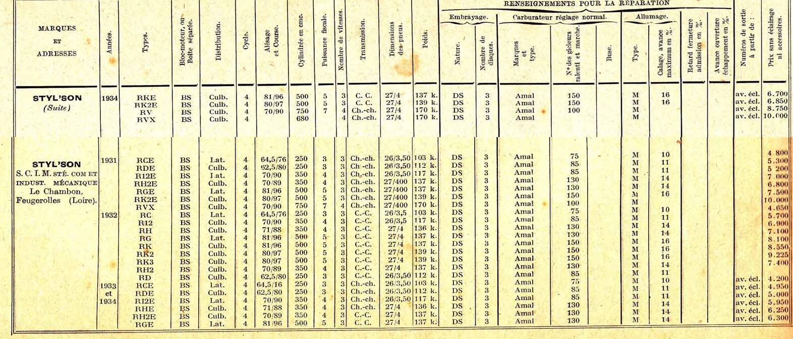 Tableaux des renseignements techniques et commerciaux sur les motos Styl'Son et Moto-Monté.