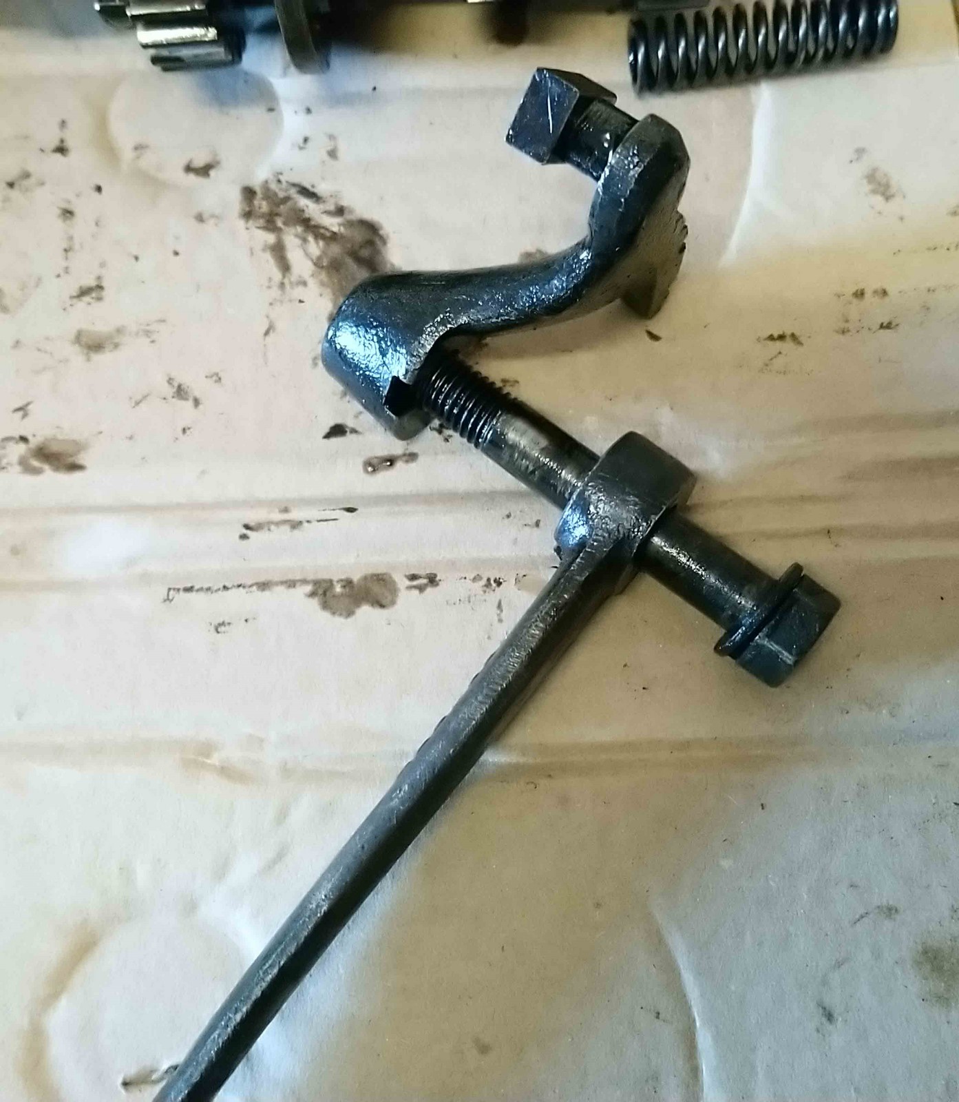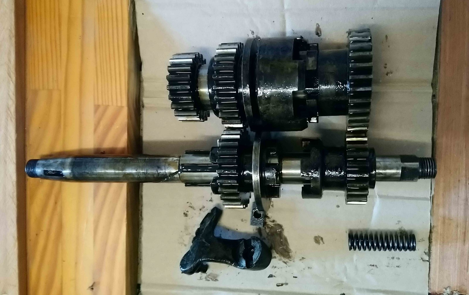Le démontage du carter de boite, diffère peu des autres boites Burman. Desserrer tous les écrous du carter de kick. Démonter l'ecrou du rocher de kick (écrou sens de filetage à droite), sortir les pignons et le ressort et décoller le carter. Après extraction des axes, pignons et fourchette, le démontage des roulements s’effectuent à la chauffe (un petit four dédié pour cela est une bonne solution). Au remontage, ne pas oublier de remettre en place le ressort de verrouillage de la sélection. Le remontage est plus facile en positionnant les pignons en troisième. Sur cette photo, le pignon de prise directe n'est pas présent, il est resté dans le carter de boîte.