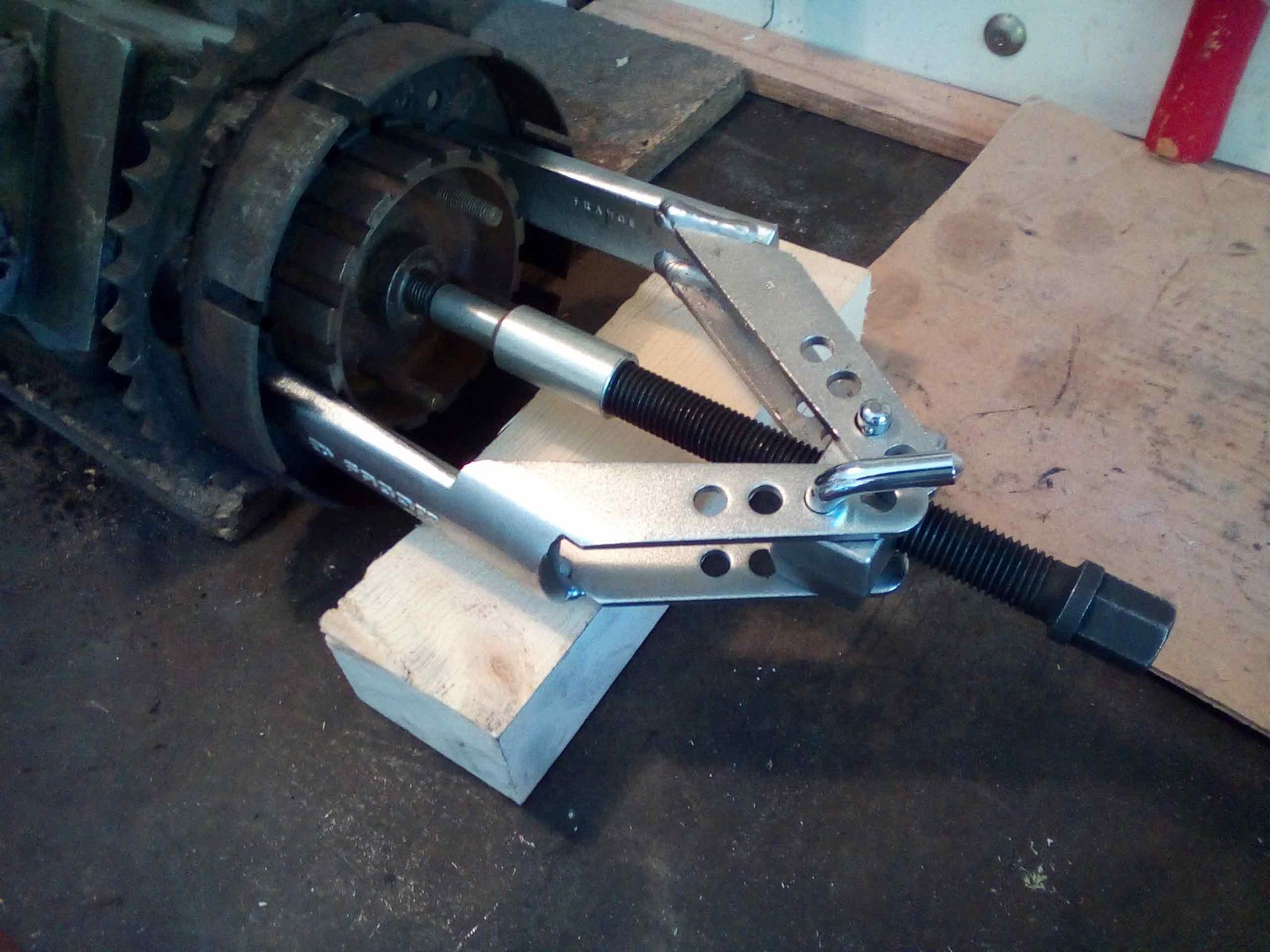 L’embrayage d’une boîte Burman type SLEBH (et aussi d’une type M) est monté sur cône et clavette. L’extraction demande un peu de méthode, car il est illusoire de prendre appui sur la couronne d’embrayage. L'arrache doit prendre sur la noix d'embrayage, qui présente une meilleure rigidité.