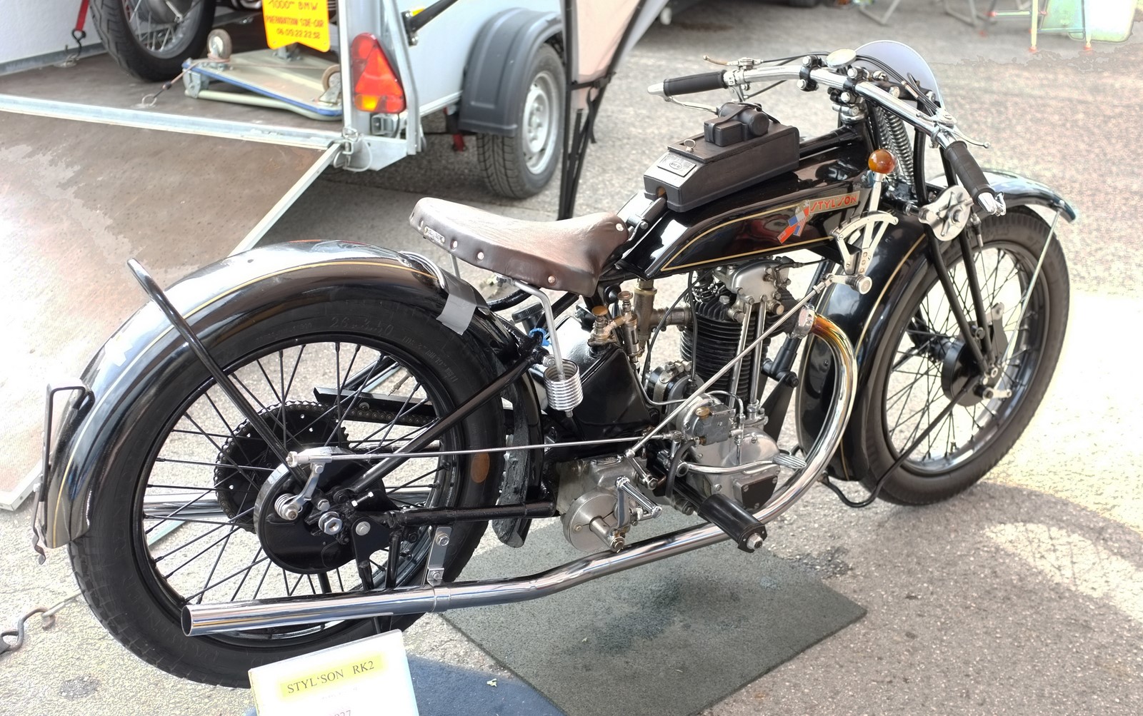 Une vue plus précise de la n°270. Très belle entretube. Pas sur que ce soit une Styl'son, mais on reconnait nettement des éléments de St Etienne, comme le cadre, la fourche, et les garde-boues, identiques à la production Ravat. Cadre et réservoir FSS6 1926 à moteur Zurcher 350 "boule", et fourche issue aussi d'une FSS6 plus récente. Aucune illustration n'est connue de la Styl'son 500 RG "supersport spécial", 1927 / 1928. Marc Defour hésitait pour le moteur entre un JAP à culbuteurs ou le LMP. La RF, la sportive en 350, était équipée d'un LMP 350 à culbuteurs, mais dans un autre cadre.