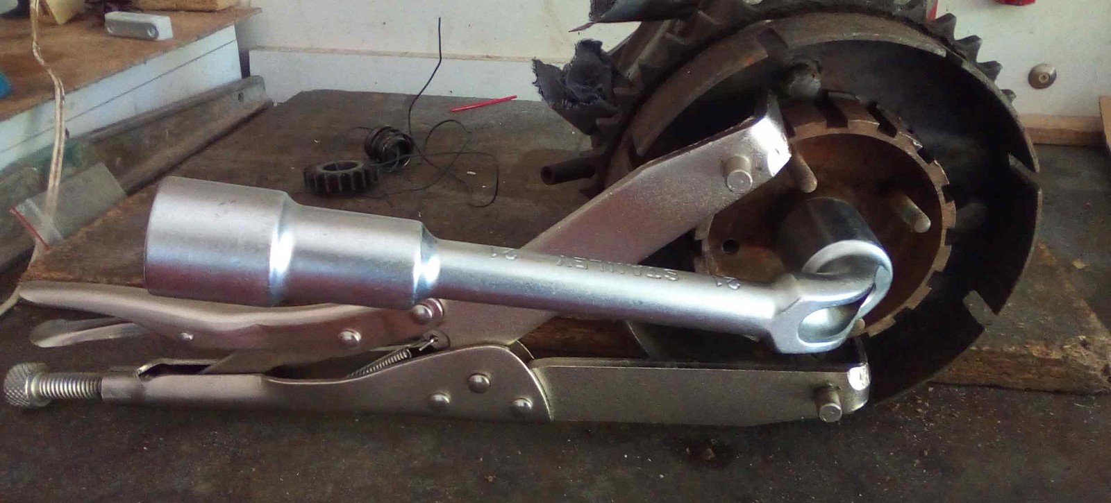 Débloquer et dévisser l’écrou à créneaux qui rend solidaire la noix de la cloche, afin de gagner de l’espace pour passer les bras d’un arrache sous la noix. Pas à droite aussi. Il faut une clé à ergot pour l’écrou rond à créneaux et de nouveau la pince étau spéciale pour verrouiller la noix. Outils disponibles à prix modeste chez tous les équipementiers et outilleurs spécialisés auto motos anciennes