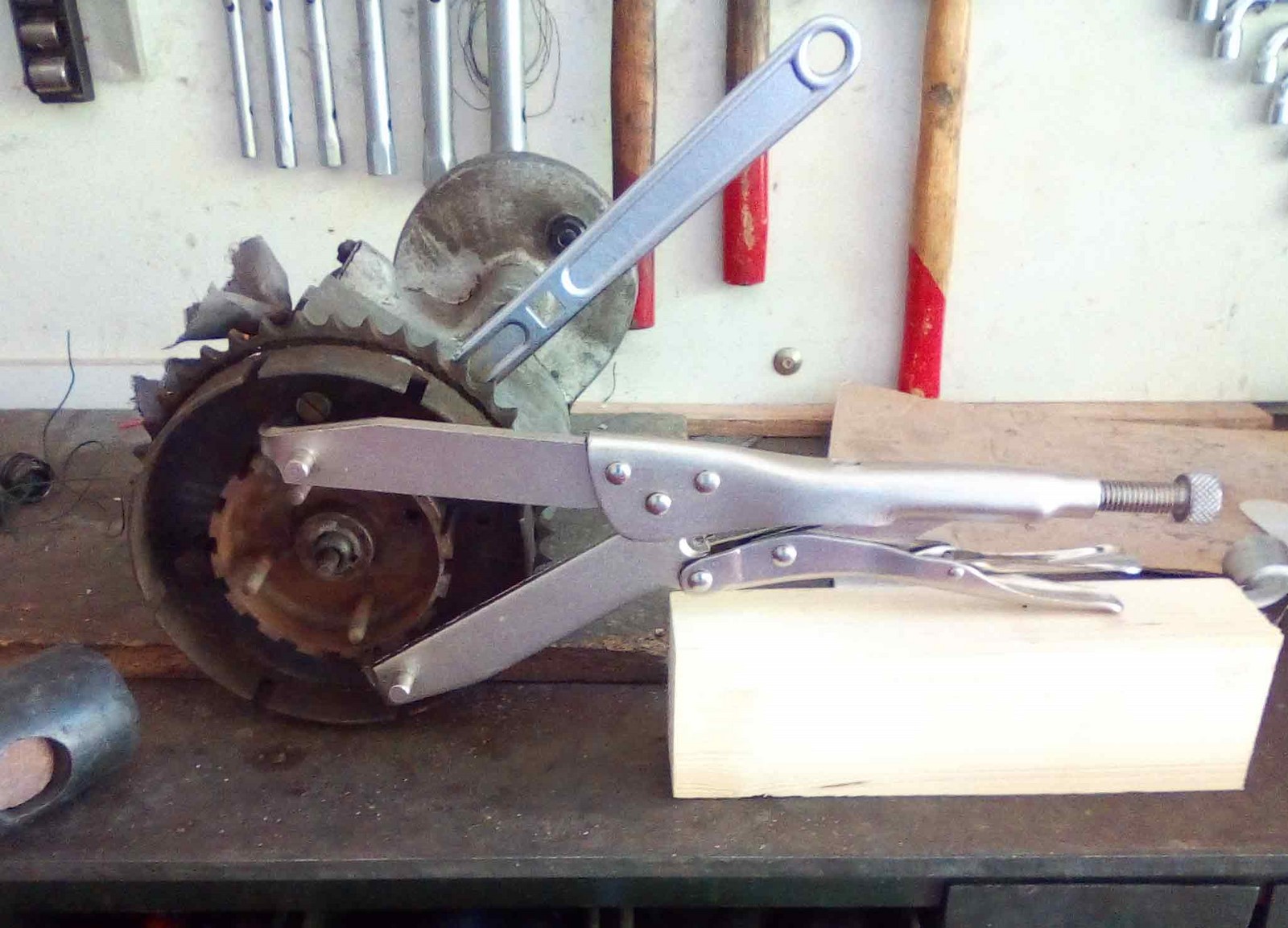 Enlever l'écrou de blocage de la noix sur l'axe primaire, avec ici l'utilisation d’une pince étau pour verrouiller des pignons, des noix d'embrayage ou volant magnétique. Pas à droite pour l’écrou.