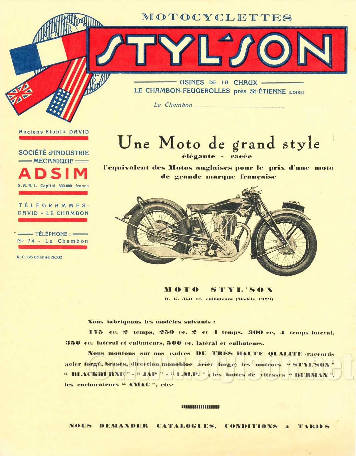 Prospectus daté de 1929, qui résume toute la gamme, avec la présence de moteurs "Styl'son" (probablement Péa), ainsi que de LMP. Les bicylindres ne sont pas catalogués