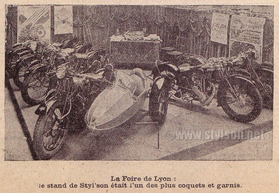 Le stand Styl'son en avril 1929 à la foire de Lyon. Pas très grand, mais représentatif avec 6 motos, dont un side. Les machines sont impeccables, peintures, chromes et nickels brillent. On reconnaît une 500 RK, mais difficile d'identifier les autres motos. Au fond, à gauche, l'affiche Styl'son. Le commercial vous attend à son bureau pour tout renseignement et pour prendre commande!