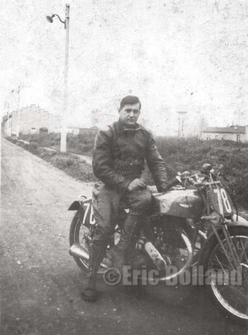 Raymond Bolland pose avec son attelage pour le grand prix de Lyon en 1937. La moto a encore sa livrée FIMA Styl'son.