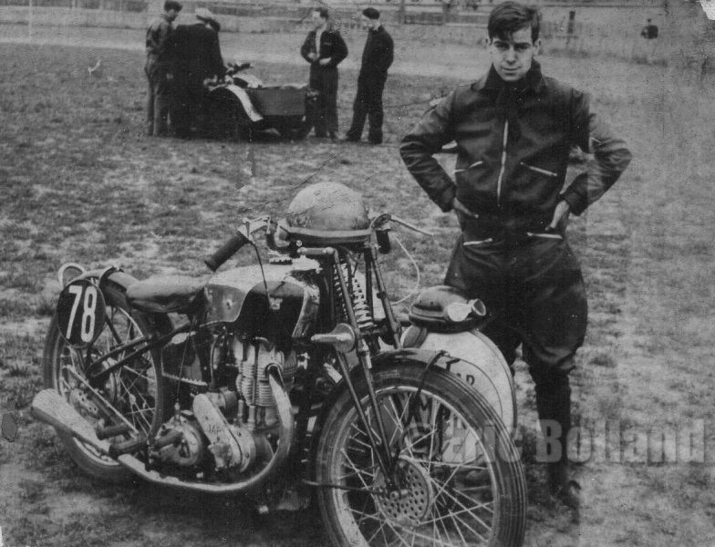 Séance photo lors d'essais type Grass Track en 1938. Le side servait aussi pour ce genre de compétition. C'est le passager, Emile Bettancourt qui prend la pose, avec un équipement de pilote très sérieux. L'ensemble a changé de couleur et est devenu noir et chrome. Une photo magnifique, qui démontre que la moto survivante, au réservoir prés est restée authentique.