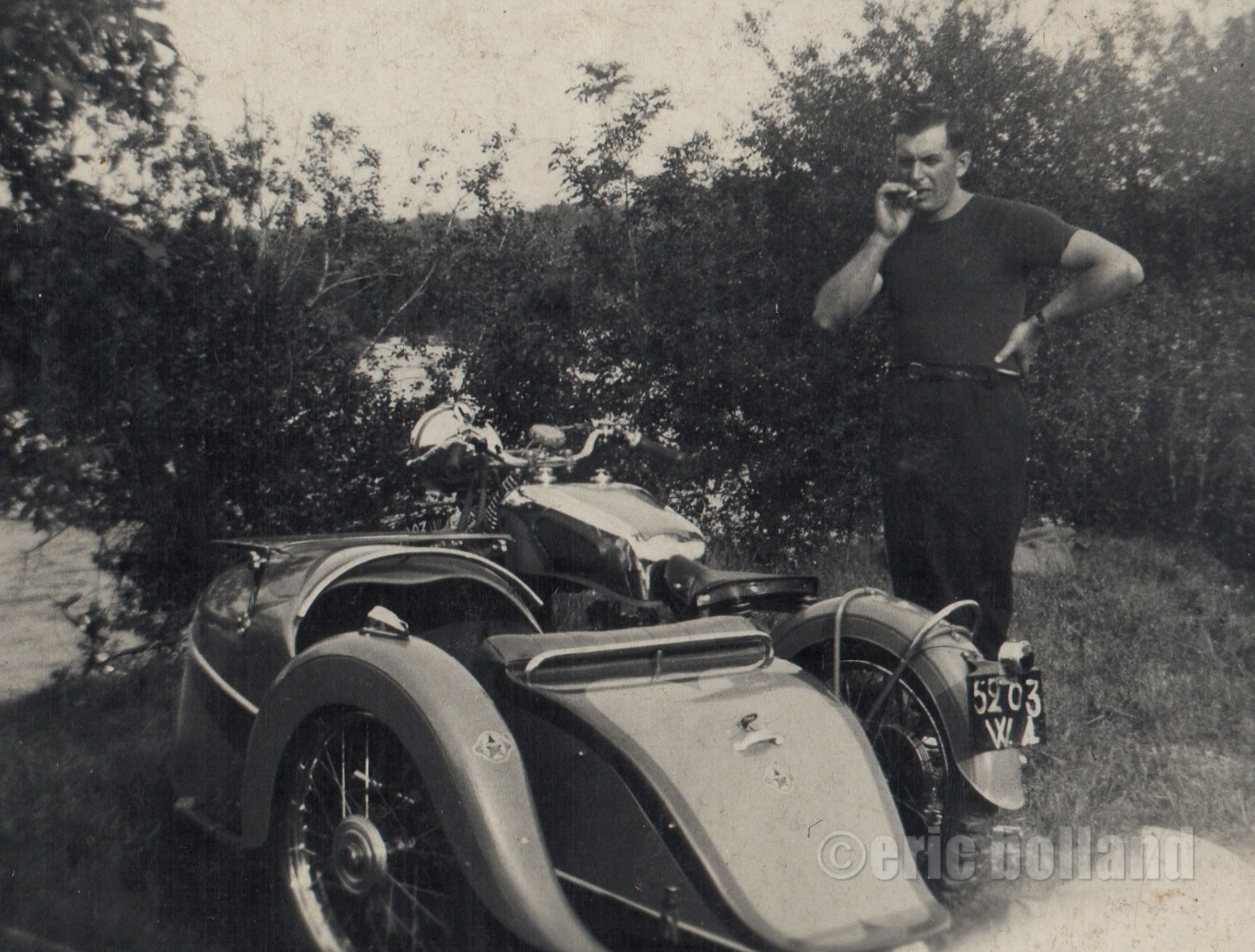 La même machine avec les décalcomanies RM, Racing Moto Lyon. Le side a changé. C'est un Simard " Tourisme Grand Luxe", dont la ligne est magnifique avec ce garde-boue fuyant très travaillé. L'éclairage avant est désormais confié à un imposant phare obus chromé. Le réservoir massif, dispose de deux bouchons rapides.