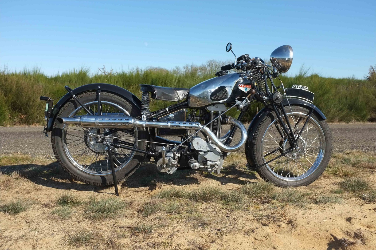 Les équipements spécifiques comme le réservoir en crosse, le JAP culbuté carter sec et les échappements relevés confèrent à ce modèle une ligne qui ne laisse pas indifférent. Ci-dessous un extrait du catalogue FIMA Styl'son. Cette machine existait aussi en 350, sous la dénomination RL, et pouvait être équipée, soit d'un JAP carter sec, soit d'un Blackburne 1 échappement. Le phare pouvait soit être de type "obus", ou plus classique comme ce BRC.