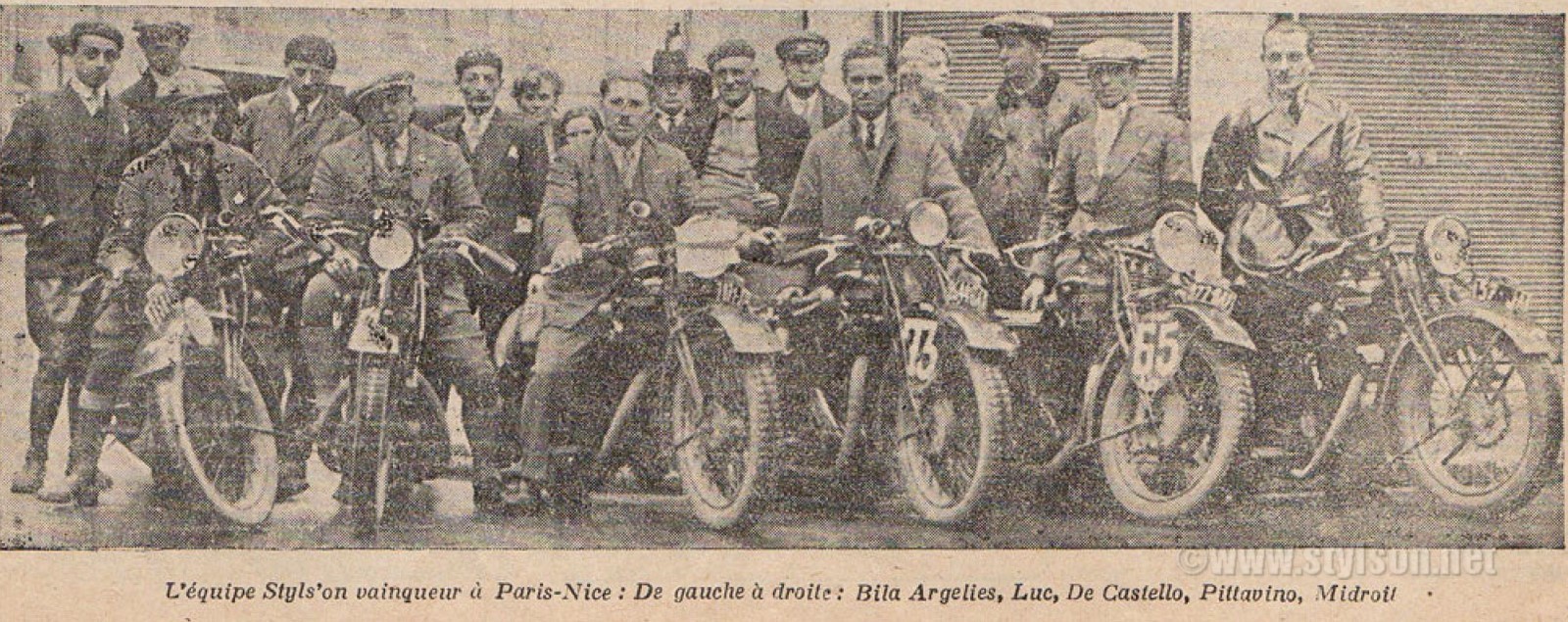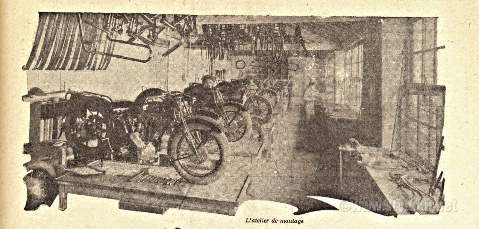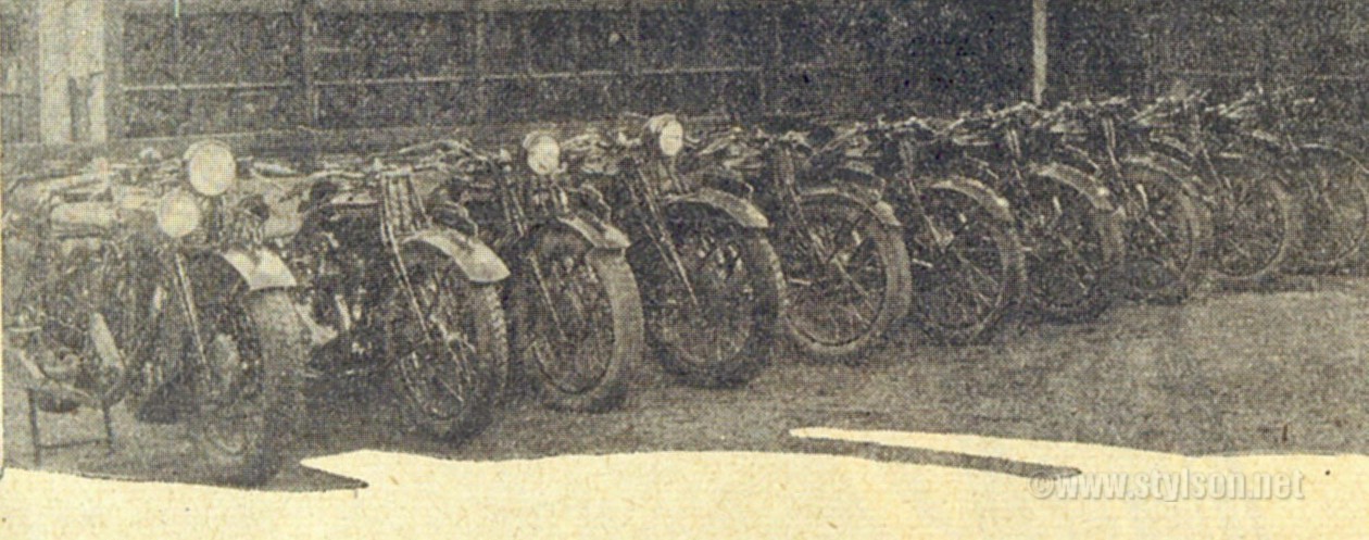 Des motos prêtes à la livraison., devant les fenêtres de l'atelier. Peu d'éléments à extraire de cette photo charbonneuse, de 1929, avec 10 Styl'son. Peu de machines disposent de l'éclairage, la première est équipée d'un phare optionnel de type Cyclope, pour un sportsman noctambule ... Les guidons "réversibles" sont montés soit "racing" soit "GT"