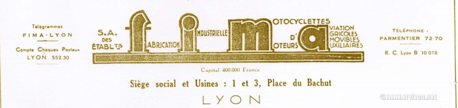 Toutefois, Styl’son n’en a pas fini d’agoniser et il faut attendre 1935 pour que le concordat jette définitivement l’éponge, aussi les banquiers décident-ils de vendre la marque Styl’son. C’est la société anonyme des établissements de Fabrication Industrielle de Motocyclettes et de moteurs d’Aviation, agricoles, amovibles et auxiliaires dite F.I.M.A. qui la rachète. Cette société fut créée le 15 janvier 1935 par MM Gustave et Raymond Coquard, père et fils, Jean et Henry Lapaire (frères), Jean Garnier. Elle a pour but la fabrication, l’achat et la vente des cycles et moteurs, vélomoteurs, motocyclettes, moteurs marins et autres et leurs dérivés ; exploite le brevet N° 799.088 pour un pédalier à débrayage pour motocyclette et vélomoteurs qui ne sera demandé que le 13 décembre 1935 ; et le capital fut fixé à 50 000F et le siège social est sis 3, place du Bachut à Lyon. Or, la FIMA a acquis la marque de motocyclette et vélomoteur Rhony’x®® et sa filiale nautique.