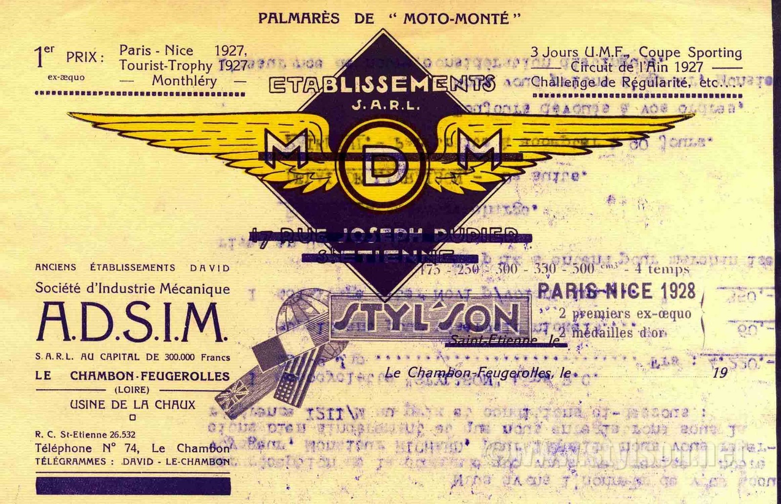 En juin 1928, avec effets rétroactifs au 1er janvier, les Etablissements David deviennent la SRL des Anciens établissements David, Société d’Industrie Mécanique dite A.D.S.I.M, sise, impasse Brossard au Chambon-Feugerolle dans une ancienne maison d’habitation louée à M. Garoux. Ceci étant, l’A.D.S.I.M. n’est qu’une société commerciale incorporée à la SRL Boissieu et David ce qui permet tout de même à nos deux associés (les beaux frères) d’opérer à une réorganisation industrielle de leur activité dans les deux bâtiments d’habitations (rue Michelet et impasse Brossard) qui font partis d’un ensemble d'immeuble unique et cohérent offrant 800m² couvert que sépare deux cours intérieures de 300m² chacune. En outre, Mme Vve David prête gratuitement à son fils et à son gendre une ancienne maison d’habitation de 900m² couverts avec terrain située route de Saint-Romain et distante de 400m de l’usine principale. Ils peuvent maintenant organiser la production des motocyclettes Styl’son et Moto-Monté. Dans celle de l’impasse, on y trouve le bureau de la direction et celui de M. Bourrelier ainsi que des ateliers d’usinages et de montages répartis au rez-de-chaussée et au premier étage ; quant à celui de la rue Michelet, il comprend les magasins de matières premières et de pièces détachées ainsi que le stockage des machines finies ; les deux hangars sont les ateliers de peintures. Toutefois, la Société ne possède aucune machine-outil importante, mais seulement les bancs et outils individuels nécessaires aux opérations de montage, une forge, des petites installations de soudure autogène, de brasage, de polissage et d’émaillage. Rue Saint-Romain, l’outillage est encore plus sommaire. Le Crédit Lyonnais notera que l’organisation de la SRL Boissieu et David est dans l’ensemble très défectueuse alors que les machines Styl’son commencent à jouir d’une excellente réputation. Bref, chez Styl’son/Moto-Monte, on ne fabrique rien sinon peu de chose. MM. Boissieu et David ont donc fait le choix d'acheter et d’assembler des pièces détachées homogènes et finies : cadres et pièces détachées AYA, moteurs JAP de chez Moto-Comptoir et Burney-Blackburne importés d’Angleterre, carburateurs AMAC, boîtes de vitesses Bridier-Charon puis Burman & Sons de Birmingham, magnétos MEA puis France Lyon (moins chère), selles Terry, pneus Dunlop… Pour au final produire d’excellentes motocyclettes. D’ailleurs, ces deux messieurs interrogés par le Crédit Lyonnais ne s'embarrassèrent pas en affirmant qu’ « il est clair dans leurs esprits que la Styl’son devait tenir parmi les marques de motocyclettes, la place qu’occupe actuellement la Bugatti parmi les marques d’automobiles (machines de vitesses et de courses) » (sic). En cette année 1928, l'A.D.S.I.M - SRL Boissieu et David livra 358 machines générant un chiffre d’affaires de 1 204 000F.