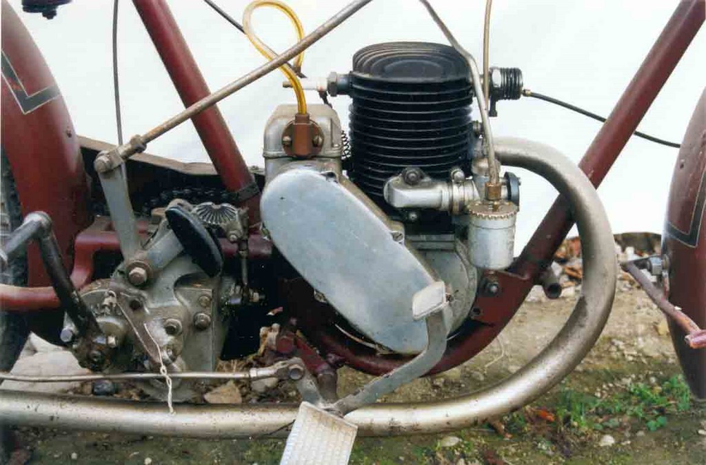 Ce moteur Brouiller n'a pas d'insigne sur le carter de magnéto. Brouiller était un constructeur de St Etienne, qui a fabriqué des moteurs mais aussi des motos : voir rubrique Brouiller. La magnéto des années 20 a été remplacée par une Morel. Même démarche pour le carburateur, beaucoup plus récent. La boîte à vitesses est une Sturmey-Archer.