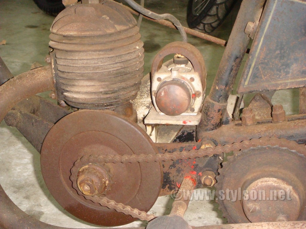 Le moteur Péa, a du parcourir de nombreux kilomètres, à en juger par l'état d'usure du pignon de sortie moteur : la chaîne doit patiner dans les montées sévères ! La magnéto MEA est à avance fixe. L'embrayage est mono-disque, un gage de moindre inertie.