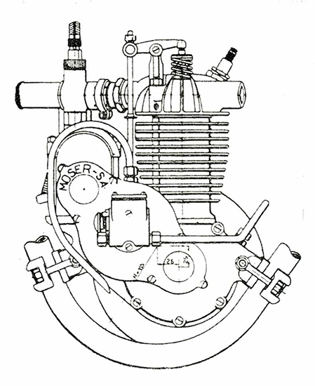 Le moteur Moser est un 175cc de type A (côtes 60 X 61mm). Les soupapes sont parallèles, et actionnées par les 2 tiges poussoir, visible à l'arrière du cylindre. L'entraînement de la magnéto et de la pompe à huile (ici une Pilgrim) s'effectue par cascade de pignon. Vilebrequin et arbre à came sont montés sur roulements à bille, et le piston est en aluminium. Cette mécanique se fixe au cadre via des demi-colliers. Cette version du 175 Moser est capable d'emmener la moto à une vitesse de pointe d'environ 80 Km/h.