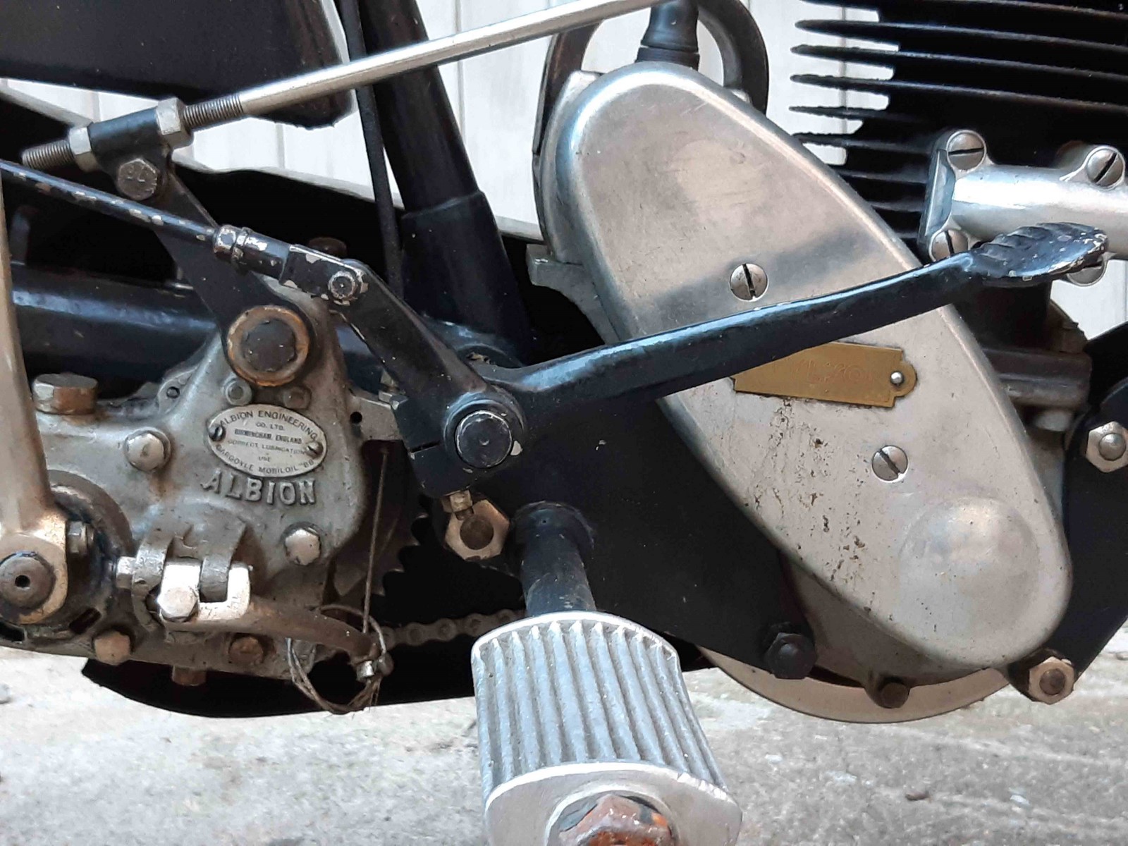 Le 175 Péa P1 est associé à une boîte à 3 vitesses Albion. Alors que les autres motos de la marque vont avoir des repose-pieds avec des blocs caoutchouc, les types AB ont encore les élégants modèles en aluminium coulé. On remarque aussi, l'effort d'ergonomie avec la pédale de frein en 2 parties. L'angle de la pédale de frein peut être ainsi ajusté...au mieux !