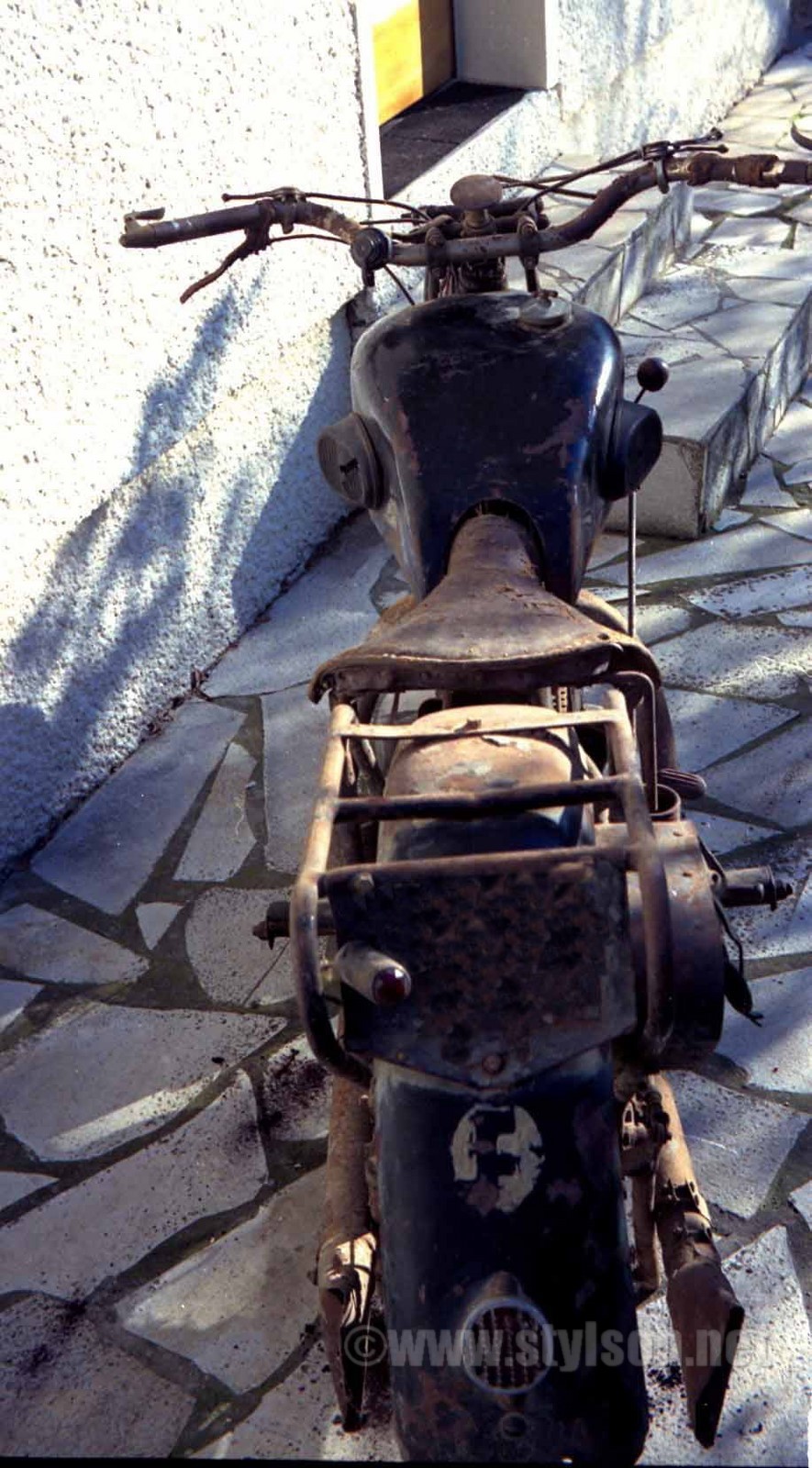 Vue arrière de la 250 RD, les tubes sont en miettes, et la moto perd de la rouille à chaque mise en béquille.