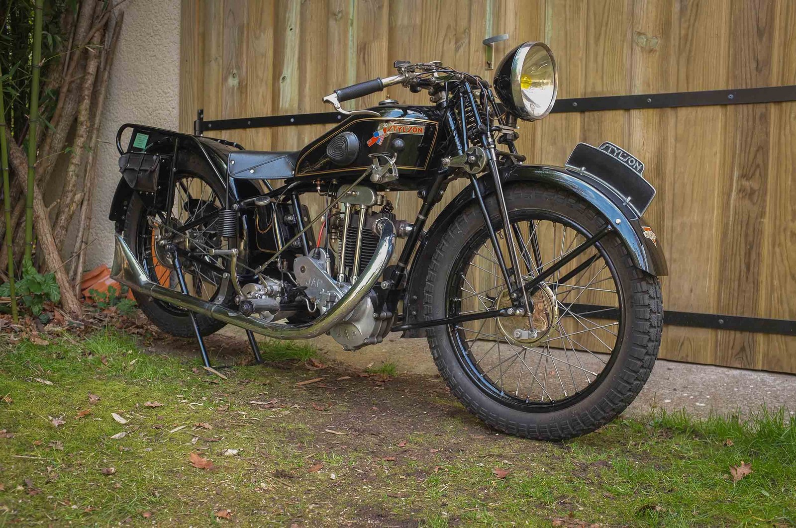 Une Styl'son RD de 1930. La fourche AYA dispose ici d'un seul ressort en compression. La décoration de la machine ne correspond plus à l'origine, avec ses décalcomanies de type "grand luxe", non disponibles au moment de la restauration. Ces décalcomanies font aujourd'hui parties des réalisations du club du Motocyclettiste et sont disponibles chez Chambrier.