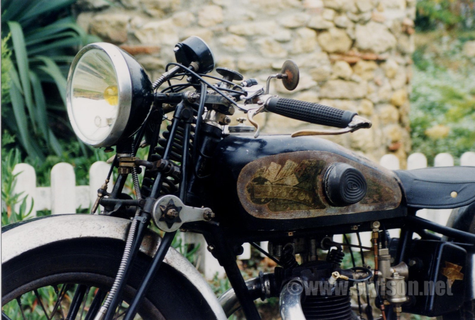 Gros plan sur la décoration grand luxe de cette Styl'son RD. Les décalcomanies exhibent bien le globe et les trois drapeaux de cette marque mondiale... Comme pour toutes les décalcos Styl'son il est bien difficile de reconnaître les couleurs d'origine. La fourche AYA mono ressort en compression dérive tout droit de la caractéristique double ressort en traction.
