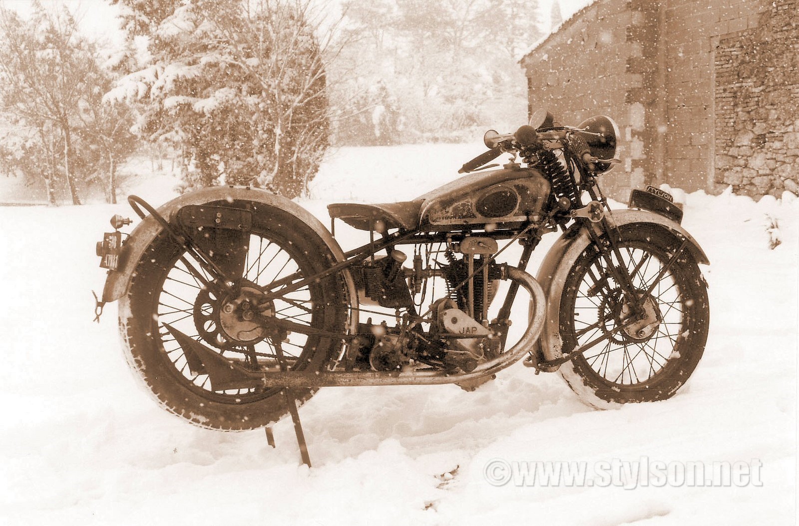 Cette Styl'son RDE est dans une livrée "grand luxe", avec son réservoir, les jantes et ses pare-boues chromés. Les parties chromées sont peintes d'un bandeau noir, limité par 2 filets dorés. Les jantes adoptent la même décoration, un bandeau noir central et 2 filets dorés. Cette machine semble être restée dans son "jus", et pourtant, elle a fait l'objet d'une véritable restauration, comme en témoigne la photo "sortie de grange". La patine d'origine est conservée et ceci nous permet de voir une moto pour laquelle, aucun doute n'est possible sur son authenticité. Le JAP culbuté à subi une rénovation, et les silencieux d'échappement, une petite découpe "esthétique".Le moteur date la moto à 1930, la carte grise donne une première mise en circulation en 1932.