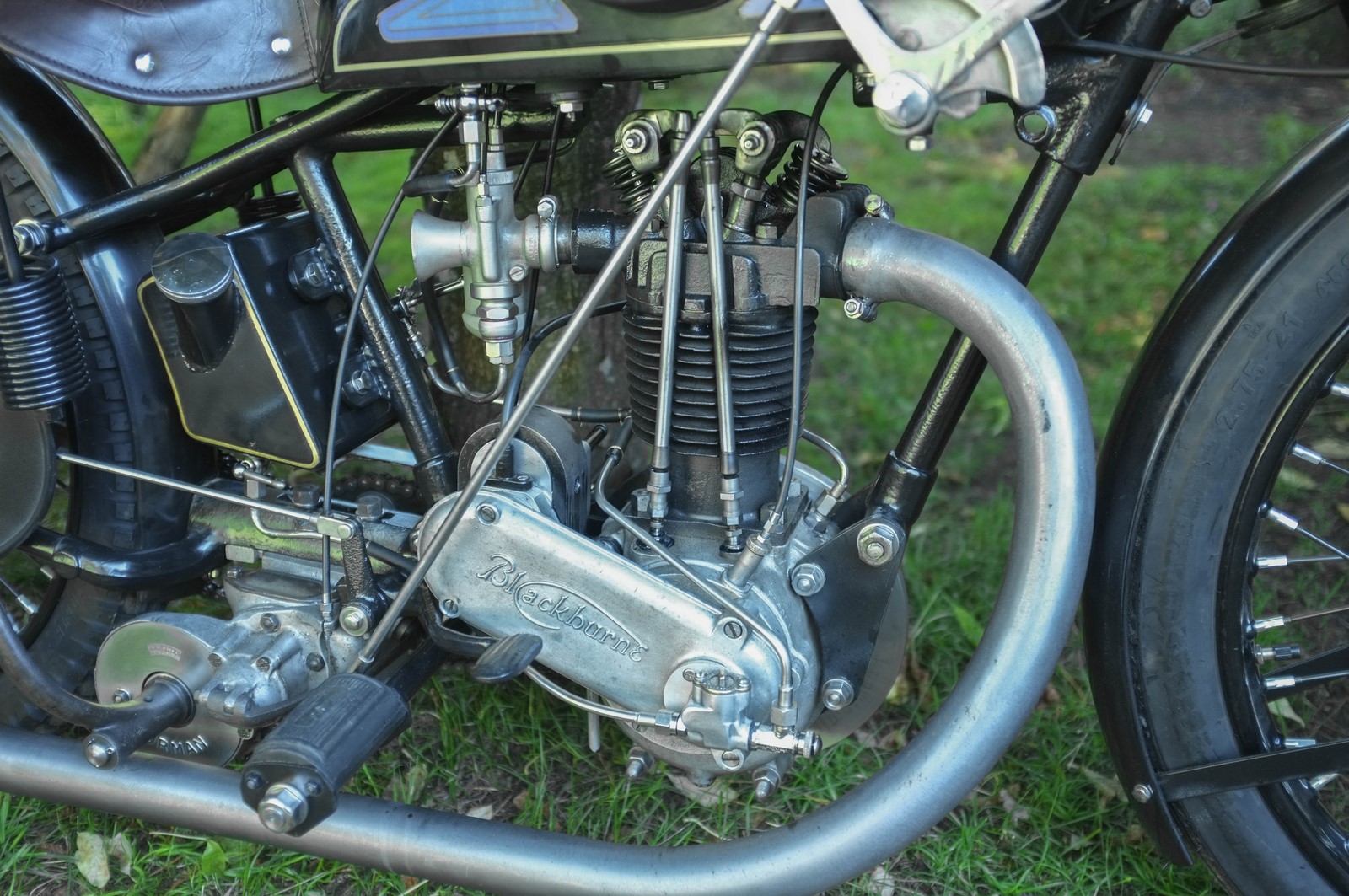 Le Blackburne à culbuteurs et volant extérieur fut utilisé par de nombreux préparateurs et assembleurs dès le début des années 20. Il est très présent sur les motos utilisées pour les courses sur le circuit de Brookland. Ce moteur, léger et fin a une indéniable allure racé. Les culbuteurs oscillent sur des fourches rapportées et vissées sur la culasse, ce qui accentue la finesse de cette mécanique.