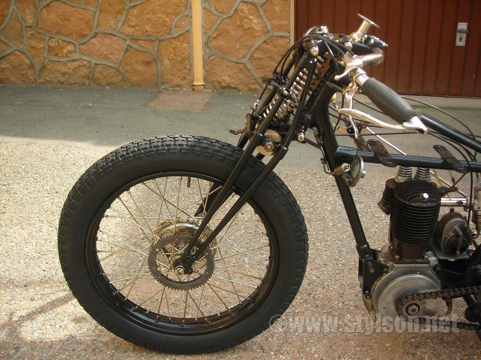 Une belle vue sur la fourche AYA, et sur le volant en aluminium destiné à l'entraînement par friction, de l'alterno Magnéto France. La pipe d'admission est percée pour actionner un avertisseur à dépression, un accessoire utile pour annoncer l'arrivée de la "moto de grand style", mais peut être que l'échappement presque libre... Sur le moyeu AYA, la couronne d'entraînement du compteur attend la mise en place de son renvoi d'angle.