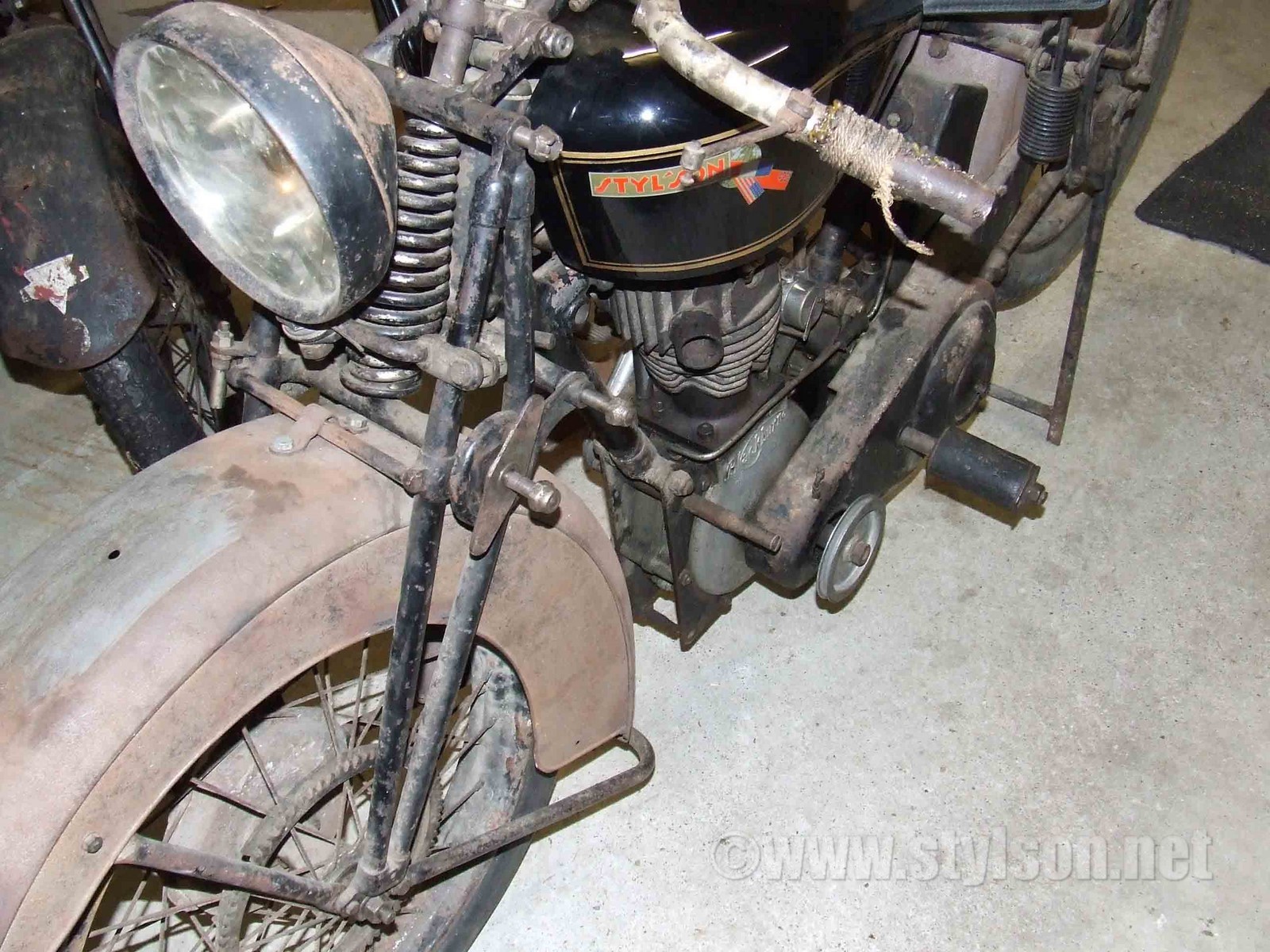 La large fourche avec un seul ressort en compression provient de chez AYA. Cette fourche est assez proche de la version précédente à double ressort en extension. Sur cette photo, les biellettes de fourche, sur le té inférieur, manquent. Les accessoires sont identiques entre cette RH, et d'autres modèles à moteur J.A.P ou Péa, frein de direction, repose pied, boite à outil, pédale de frein et guidon réversible.