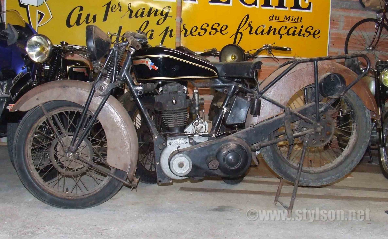 Cette Styl'son RH de 1930 est en cours de restauration "ancienne", ce qui explique son état panaché, avec des éléments dans "leur jus", d'autres restaurés, semi restaurés et certaines pièces absentes. Ce modèle dispose d'un moteur Blackburne 350cc type CVA à culbuteurs, associé à une boîte Burman. La ligne générale est typique de la marque avec ses grands garde-boues enveloppants. La fourche, les roues proviennent de chez AYA, le diamètre des tambours est de 180 mm. Les RH / RK ont le même encombrement que leurs petites soeurs RC, RD, RI 2 à moteur J.A.P. Mais la section des tubes est beaucoup plus grosse. Le cadre est différent, avec les haubans supérieurs arrières boulonnés et démontables. Sous le réservoir, le tube de cadre est interrompu par un "pont" pour laisser suffisamment de place au haut moteur. Cette machine avait deux tubes d'échappement, avec les petits étouffoirs caractéristiques de chez Styl'son.