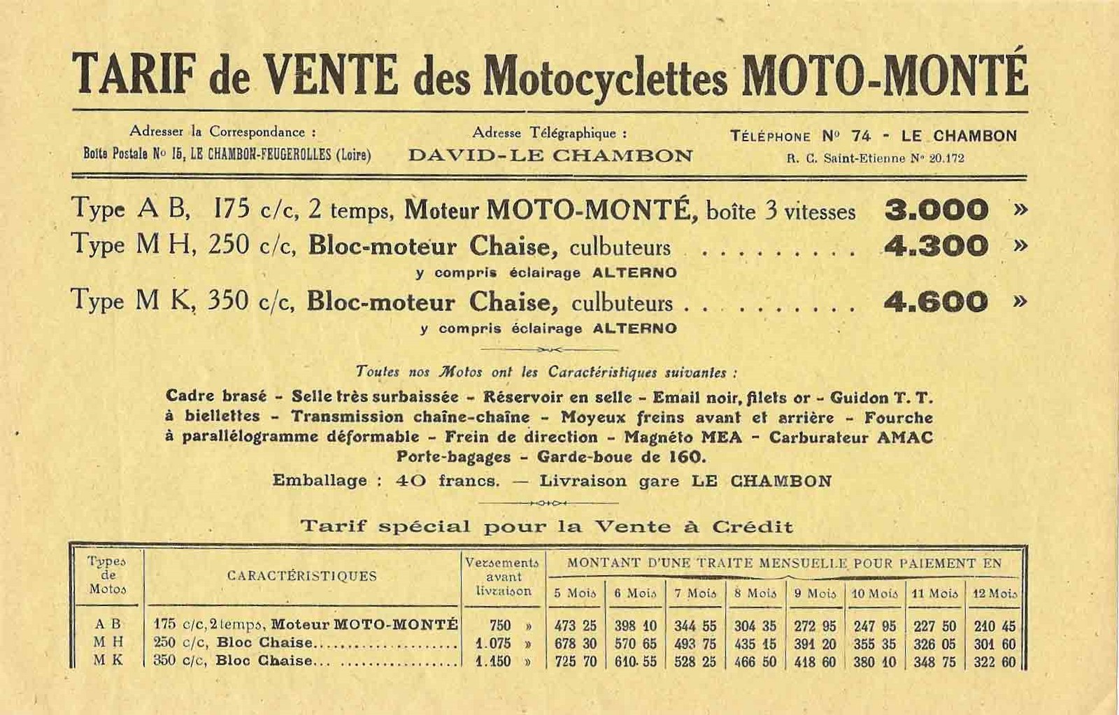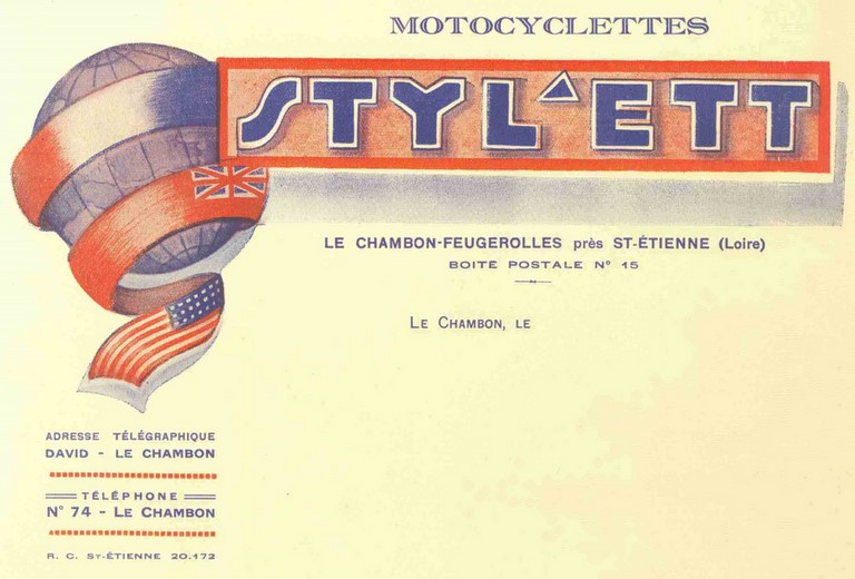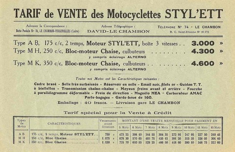 Dans cette page, les tarifications Moto-Monté et Styl'ett. Ces documents non datés sont probablement de 1929 / 1930. Nous y retrouvons la 175 AB, présente également dans les catalogues Styl'son. Le moteur Moto Monté annoncé est en fait un Péa P1. Il est donc fort probable que les 2 modèles suivants, la MH et la MK portent la même dénomination sous la marque Styl'son, que sous les deux marques Moto Monté et Styl'ett. Styl'ett n'est pas seulement cantonné dans les petites cylindrées, cette annonce présente les 250 MH et 350 MK.Un grand merci à Hervé Poncet pour ces documents, qui nous permettent d'en savoir plus sur ces Styl'son à bloc moteur Chaise.